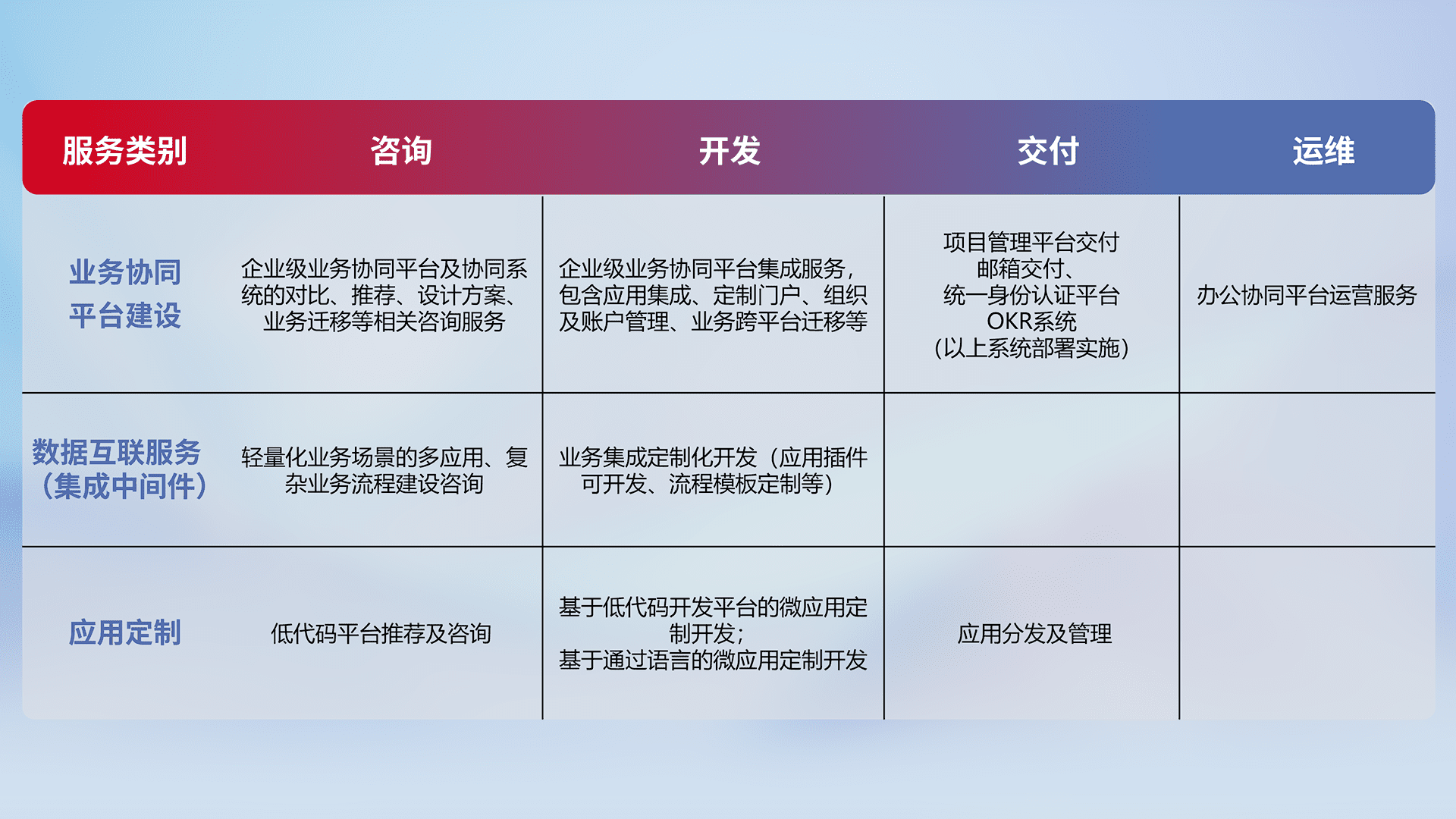 针对钉钉、、企微、、、、IDaas等平台级产品提供产品的规划、、、方案、、、交付、、、、定制化开发等服务,,实现如统一协同办公、、、、智能客户服务、、、混合会议管理、、、、智能数据查询、、、等业务场景,,实现数字化转型。。。。